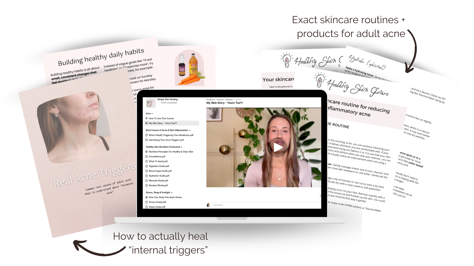 This bundle gives you all the info you need for beautiful clear skin: one course focused on internal healing through diet & lifestyle (Simple Skin Healing), and another course dedicated to repairing your skin barrier and building the right skincare routine that heals adult acne (Skin Rebalancing Protocol).