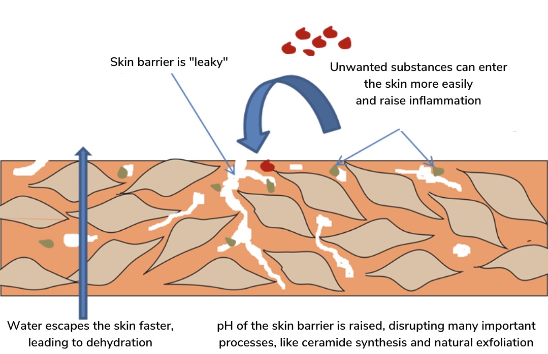 A compromised barrier leads to transepidermal water loss (TEWL), causing skin dehydration. This disrupts the skin's optimal pH, which in turn affects the enzymes responsible for natural exfoliation (desquamation) — leading to more clogged pores (the first stage of acne). Dehydrated skin may also respond by producing excess oil to compensate, further increasing the likelihood of clogged pores and breakouts.
